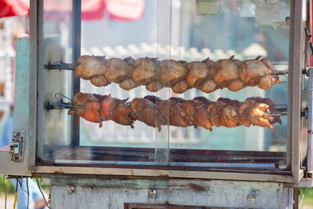closeup of roasted chicken in the market