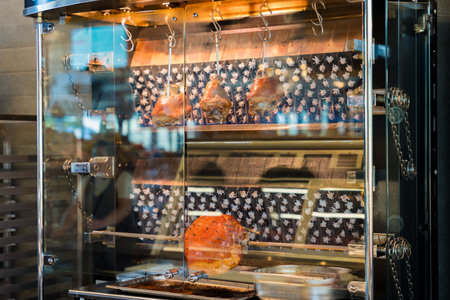 Traditional roasted pork knuckles and ham in a commercial rotisserie oven