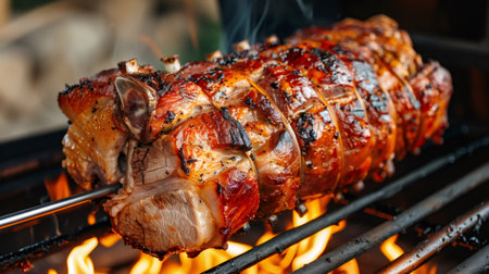 Whole spiced pork loin slowly roasting on a skewer above open flames