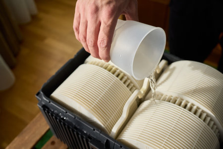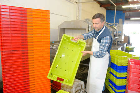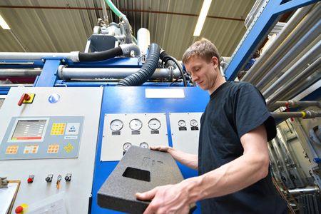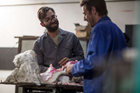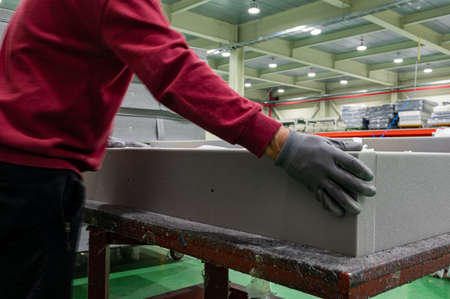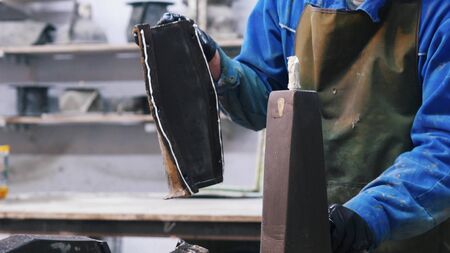 Concrete workshop - young man is cleaning concrete mold - indoor