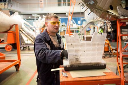 Tyumen, Russia - June 5, 2019: Aircraft repair helicopter UTair Engineering plant. Worker maintaining a Mi-8 helicopter