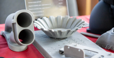 Various objects printed on a 3D printer from molten plastic powder. Different models printed on 3D printer from melted black polyamide powder. New additive 3D printing Multi Jet Fusion MJF technology