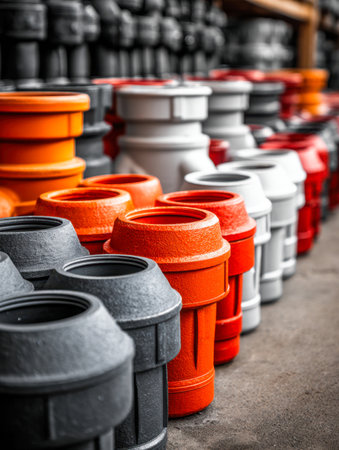 Vibrant assortment of durable plastic pipe connectors organized methodically, highlighting shades of black, orange, white, and red in a spacious warehouse setting.