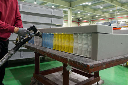 Assembling upholstered furniture in a workshop, foam rubber blank for sitting a bar stool, close-up