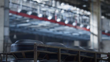 Tyre blanks conveyor line moving product working in robotic plant automatically. Automation technology work at modern industrial automotive factory production cycle. Automobile equipment concept
