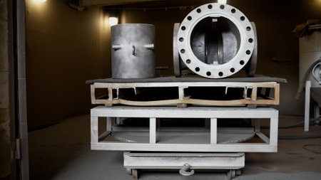 Industrial taps and plugs, painting of large parts. A large metal part leaves the paint shop. Taps and plugs, large format, for oil pipelines.