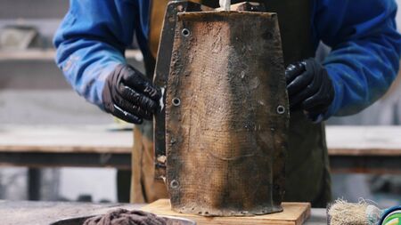 Details with the hands of a factory worker holding his dirty protective helmet.