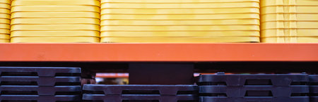 Panorama stack of tough black plastic tote made from durable recycled polypropylene and yellow reinforced snap-fit lockable lid to secure protect storage items at hardware store in Dallas, TX. USA