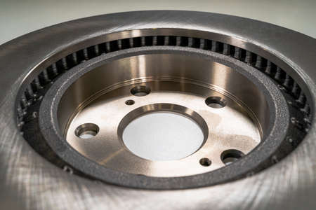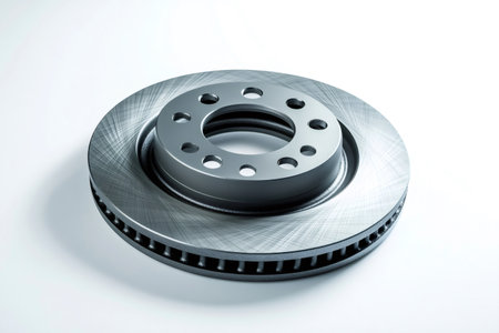 Close up of a new metallic ventilated brake disc rotor, isolated on a white background, representing essential car maintenance