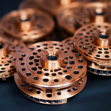 Close-up view of complex metallic components arranged in a circular pattern, highlighting precision engineering in a high-tech workshop during the day.