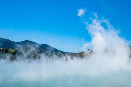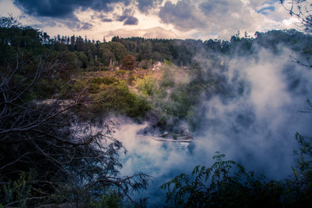 Moody landscape with steam rising pool in a geothermal zone in the mountains. Rotorua, New Zealand