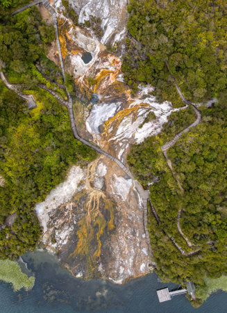 Drone view at Orakei Korako Geothermal Park on New Zealand