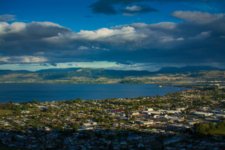 A sweeping view of Rotorua city and Lake Rotorua under dramatic skies, framed by rolling hills and lush landscapes, showcasing the natural beauty and vibrant charm of New Zealand geothermal heart