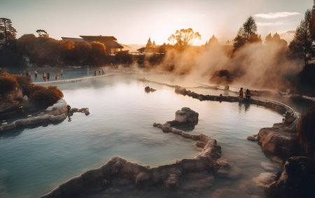 Sunset at Waiotapu Thermal Park in Rotorua, New Zealand, Te Puia thermal park. Rotorua town, New Zealand, AI Generated