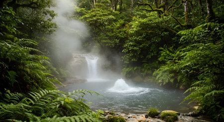 Steaming Hot Spring Waterfall in Lush Tropical Rainforest Jungle