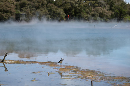 Solitary Wader Beside Misty Geothermal Lake Shoreline