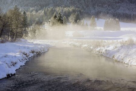 reflecting colors of sunset clouds in rural river in tirol mountains