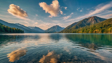 Beautiful mountain lake at sunset with reflection of clouds in calm water