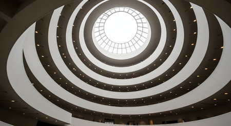 A low-angle view looking up at the iconic spiral interior of a modern museum. The concentric white ramps create a dynamic, abstract pattern leading up to a large, circular glass skylight, showcasing famous architectural design.