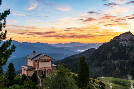 Sunrise above the king's house on Schachen from king Ludwig II and alpine hut Schachenhaus with warm atmosphere
