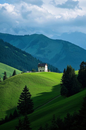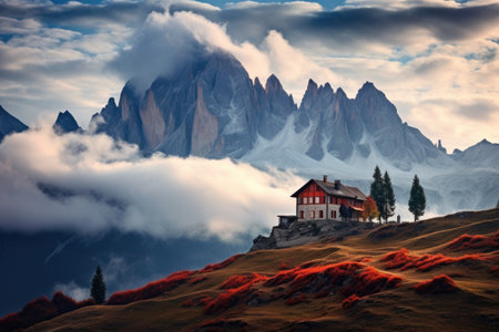 Fantastic mountain landscape with a red house in the foreground, Mountains in fog with a beautiful house and church at night in autumn, Landscape with high rocks, a blue sky with the, AI Generated