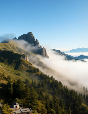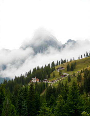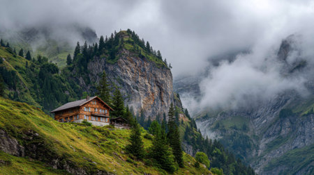 This captivating image showcases a rustic wooden cabin nestled in the lush greenery of a mountainous terrain, shrouded in mist and clouds, evoking a sense of peace.