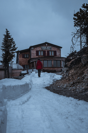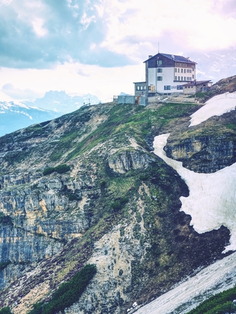 Breathtaking view on beautiful snowy mountains - a tourist building house - Dolomites, Italy