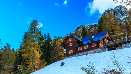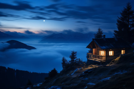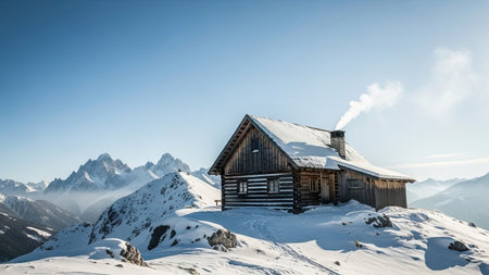 Rustic mountain cabin with smoking chimney in alpine landscape
