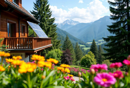 Mountain solar home. Wooden cabin with solar panel on balcony overlooking scenic mountain valley.