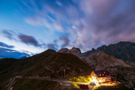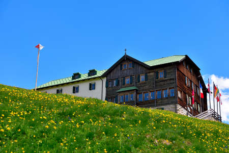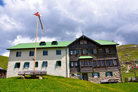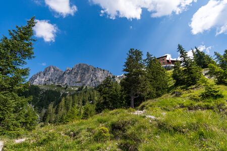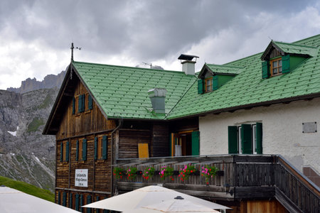 High Mountain Hut Noerdlinger Huette in the Karwendel mountain range of Tyrol, Austria near Seefeld on an August summer evening