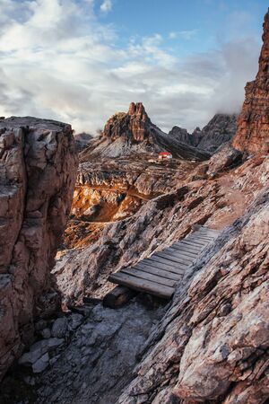 Its a long way. Extreme tourist path at the edge of the hills with wooden little bridge to the way to building standing at dolomites mountains.