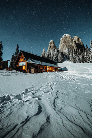 Mountain shelter under starry night sly