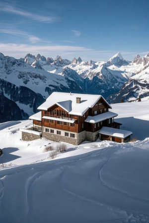 Mountain hut in the Alps. Snowy winter landscape.