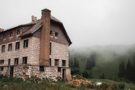 A weathered rocky old house on the grassy hill covered in fo