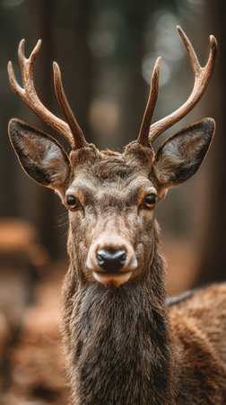 This captivating close-up of a deer showcases its striking features amidst a serene forest backdrop. The gentle gaze and impressive antlers invite viewers into the tranquil beauty of wildlife.