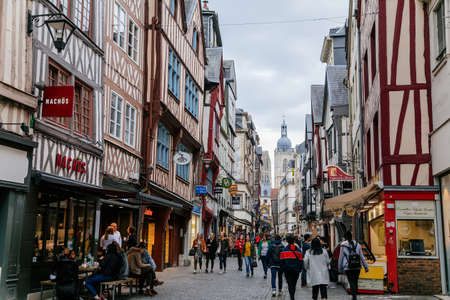 On the streets of the old town of Rouen with traditional half-timbered heritage houses. Rouen, Normandy, France, September 25, 2019