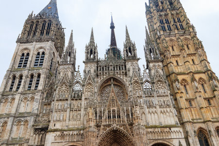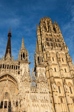 View from below on the facade of the famous Rouen gothic cathedral in Rouen city, the capital of Normandy region in France