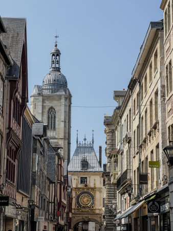 Half-Timbered Houses at the street with the Great-Clock (Gros-Horloge) astronomical clock in Rouen, Normandy, France, September 25, 2019