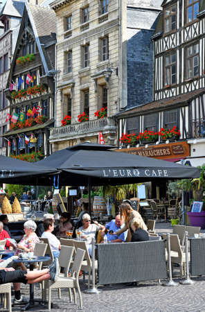 Beautiful facades of the old buildings in the central square in Honfleur, famous french town in Normandy