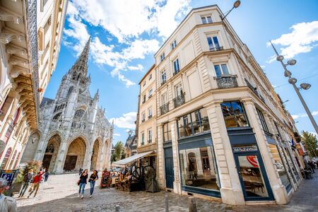 ROUEN, FRANCE - September 07, 2017: Street view with saint Maclou gothic cathedral during the sunny day in Rouen