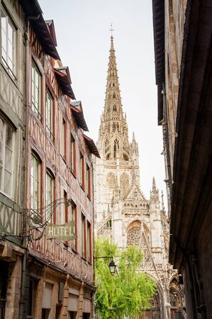 Half-Timbered Houses and Notre Dame de Rouen Cathedral, Rouen, Normandy, France, September 25, 2019