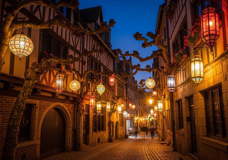 A charming cobblestone street lined with historic buildings and lanterns at dusk in a quaint European town