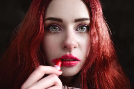 Portrait of crazy-looking depressed teen girl with red hair she is smearing red lipstick on her face, black background. social issues. social protest. The problem with raising teenagers