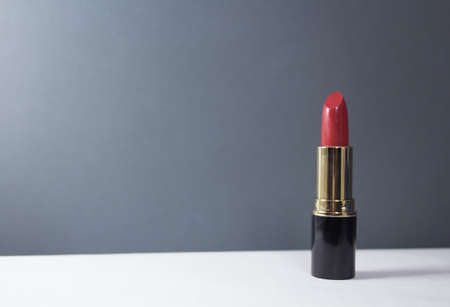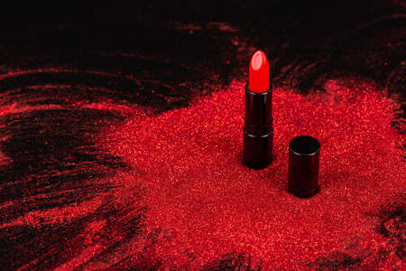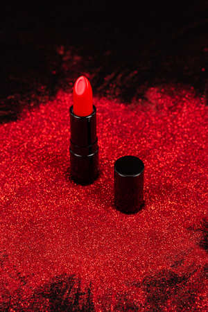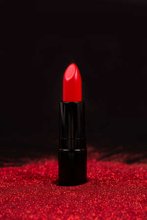 Close-up of red sparkling lipstick stands on a white table. Red lipstick is on the table.