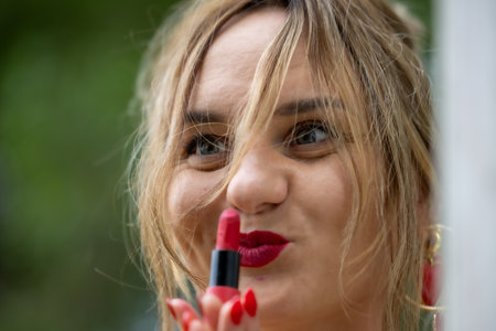 A photo of a woman applying red lipstick with matching red nails, standing outdoors. She is wearing gold earrings with red accents, and the background is filled with greenery