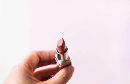 Coral lipstick in woman's hand on pastel pink background. Make up products concept.