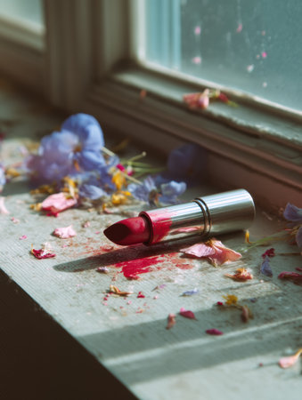 Soft sunlight illuminates a melted lipstick tube resting on a warm windowsill, surrounded by vibrant petals scattered around, creating a colorful composition.