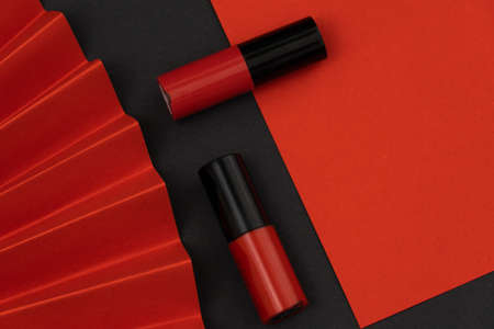 minimalist red lipstick on a black background with origami elements from red colored paper