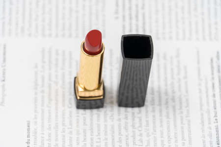 Red matte lipstick in gold and black tube package put on dark table isolated on white background in studio. Red lipstick with open cap. Makeup beauty cosmetic for confident fashion women.