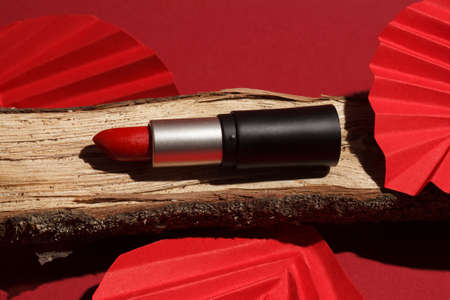 Red lipstick on wooden podium with paper craft on red background. Creative concept photo of cosmetics with hard shadow